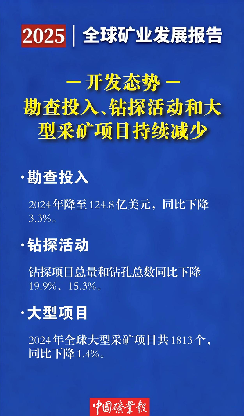 勘查開發(fā)方面,《報告》顯示,全球勘查投入、鉆探活動和大型采礦項目持續(xù)減少。2024年,全球主要固體礦產(chǎn)勘查投入124.8億美元,同比下降3.3%;鉆探項目總量和鉆孔總數(shù)同比分別下降19.9%15.3%;全球大型采礦項目共1813 個,同比下降1.4%