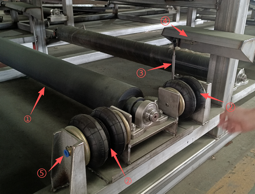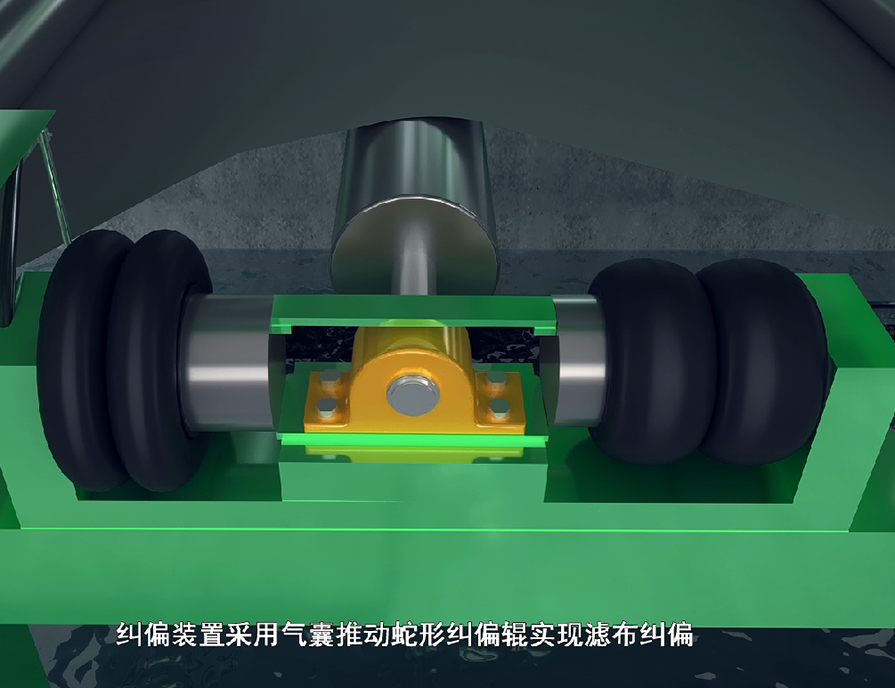 在正常運(yùn)轉(zhuǎn)中,濾布是不會碰到糾偏裝置的檢測桿。當(dāng)濾布跑偏時,濾布會碰到檢測桿,檢測桿偏移,自動糾偏裝置中的氣囊會一側(cè)充氣,一側(cè)放氣,帶動糾偏輥蛇形偏移,使濾布改變偏移方向,恢復(fù)到正常運(yùn)轉(zhuǎn)軌跡。