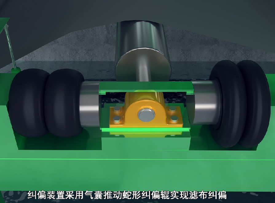 濾布在運(yùn)轉(zhuǎn)過程中可能會出現(xiàn)跑偏的現(xiàn)象,利用濾布糾偏裝置糾正濾布偏移方向,使濾布處于正常工作狀態(tài)。